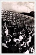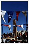 II Feria de las Naciones. Buenos Aires. Argentina. Réplica del obelisco porteño de 36 metros de alto recubierto por 10.000 paquetes de pan dulce que luego fueron distribuídos entre el público.